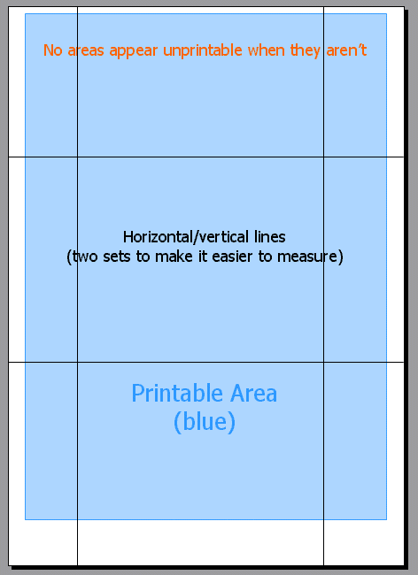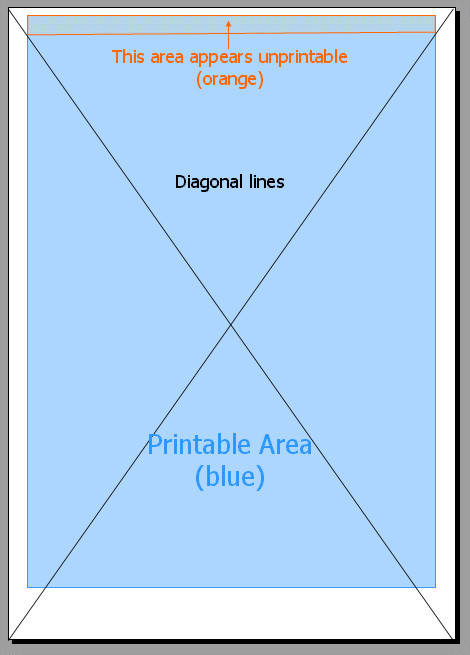 Once you have printed out your lines, you can draw in lines joining the ends of each parallel line with a ruler, and measure the distance of these from the edge of the page. You can then input these values into the Arrange > Layout Guides dialog, and make sure that you never exceed your maximum print area.